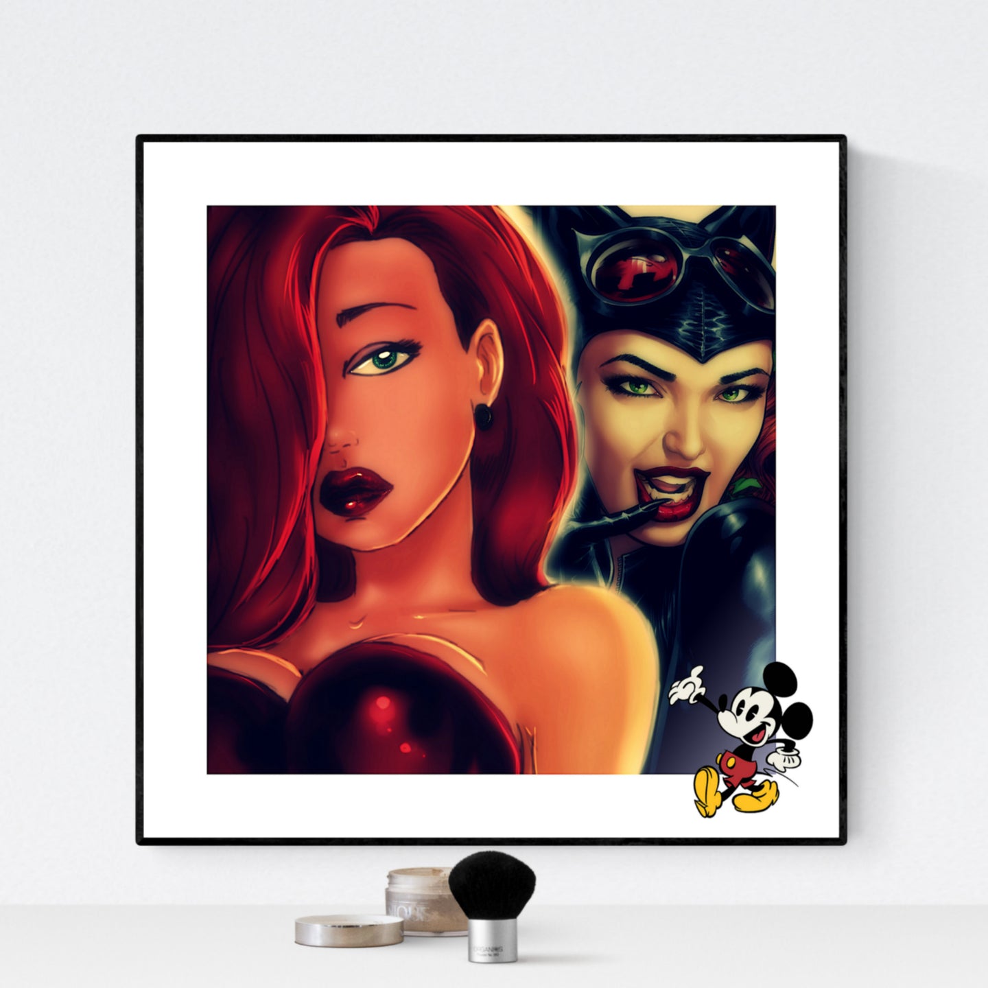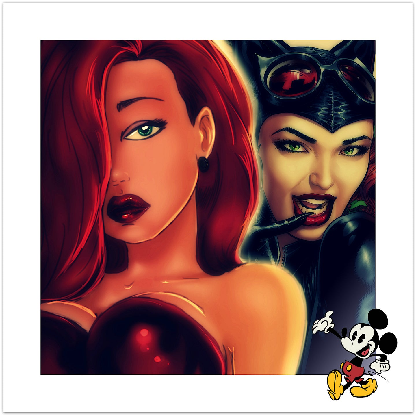 Fræk Catwoman i - bogstaveligt talt - strålende selskab med en ung og nærmest helt uskyldig Jessica Rabbit. Et pop art kunsttryk, der med sin blødhed og dæmpede farver er meget harmonisk i sit udtryk, selv om en glad lille retro Mickey Mouse kommer rask forbi og trænger sig insisterende på. Jessica er siden blevet meget frækkere, men husk hendes berømte ord: "I'm not bad. I'm just drawn that way" - og glem ikke, at få billedets forrygende fakta med i farten: